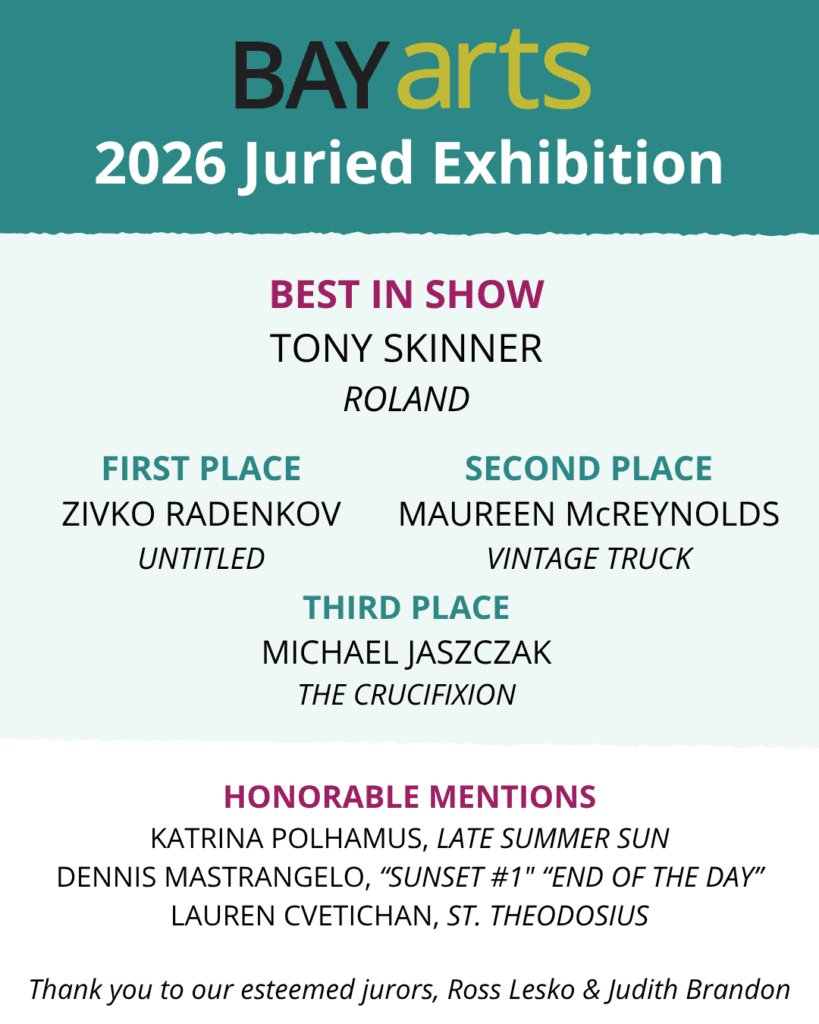 The BAYarts Annual Juried Exhibition is a vibrant community tradition, highlighting a diverse range of artwork selected by jurors and created by artists near and far.Congratulations to this year’s selected artists!